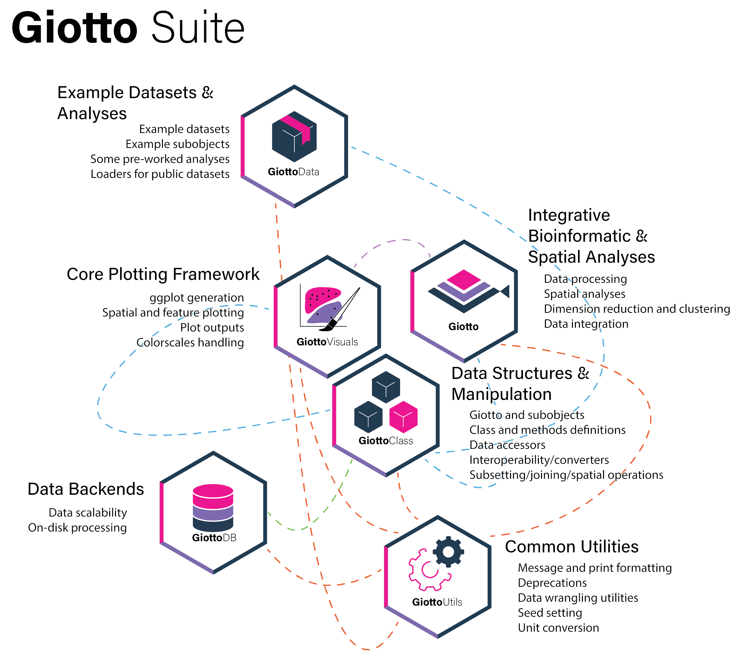 Giotto Suite is a set of packages built to effectively represent and analyze spatial-omics data. The modular nature of these packages make it easy to extend and further build upon the ecosystem. This page introduces each of the modules and outlines their purposes.