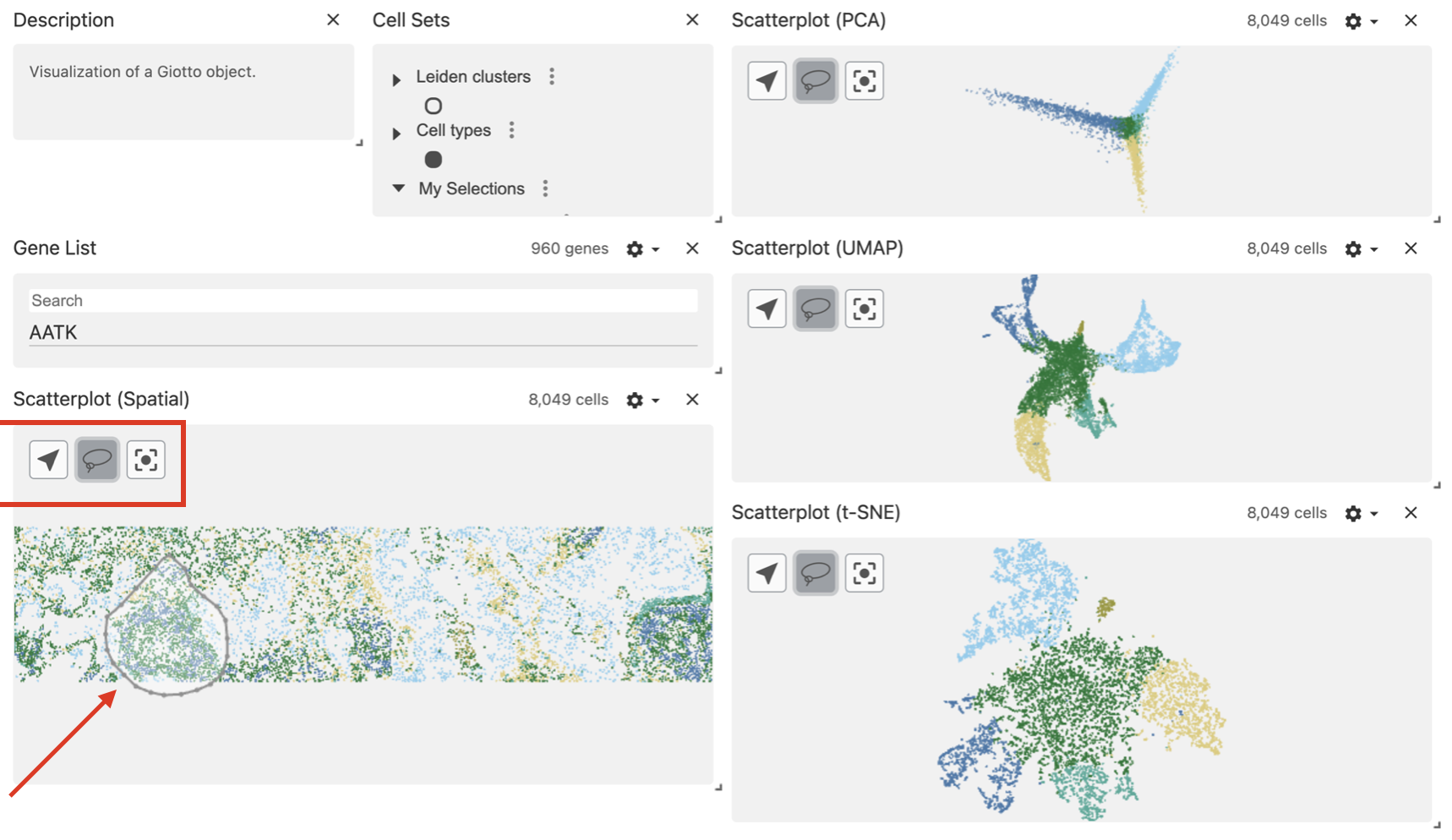 After drawing the selection, the area will be highlighted and the corresponding cells will be mapped and highlighted in the dimension reduction plots.