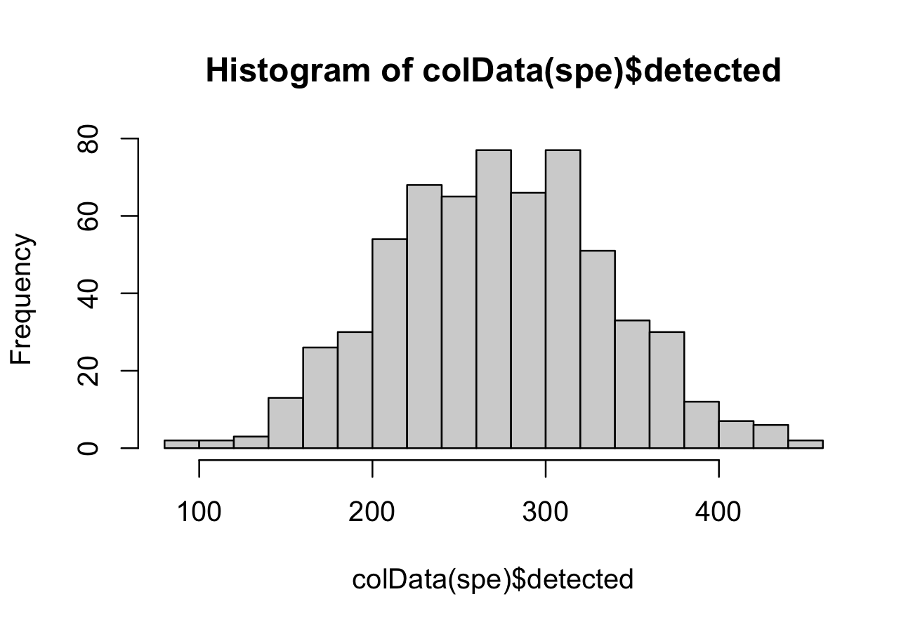 spe <- gspe[[1]]Now, we do some processing on the object including quality control, normalization, feature selection and dimensionality reduction.