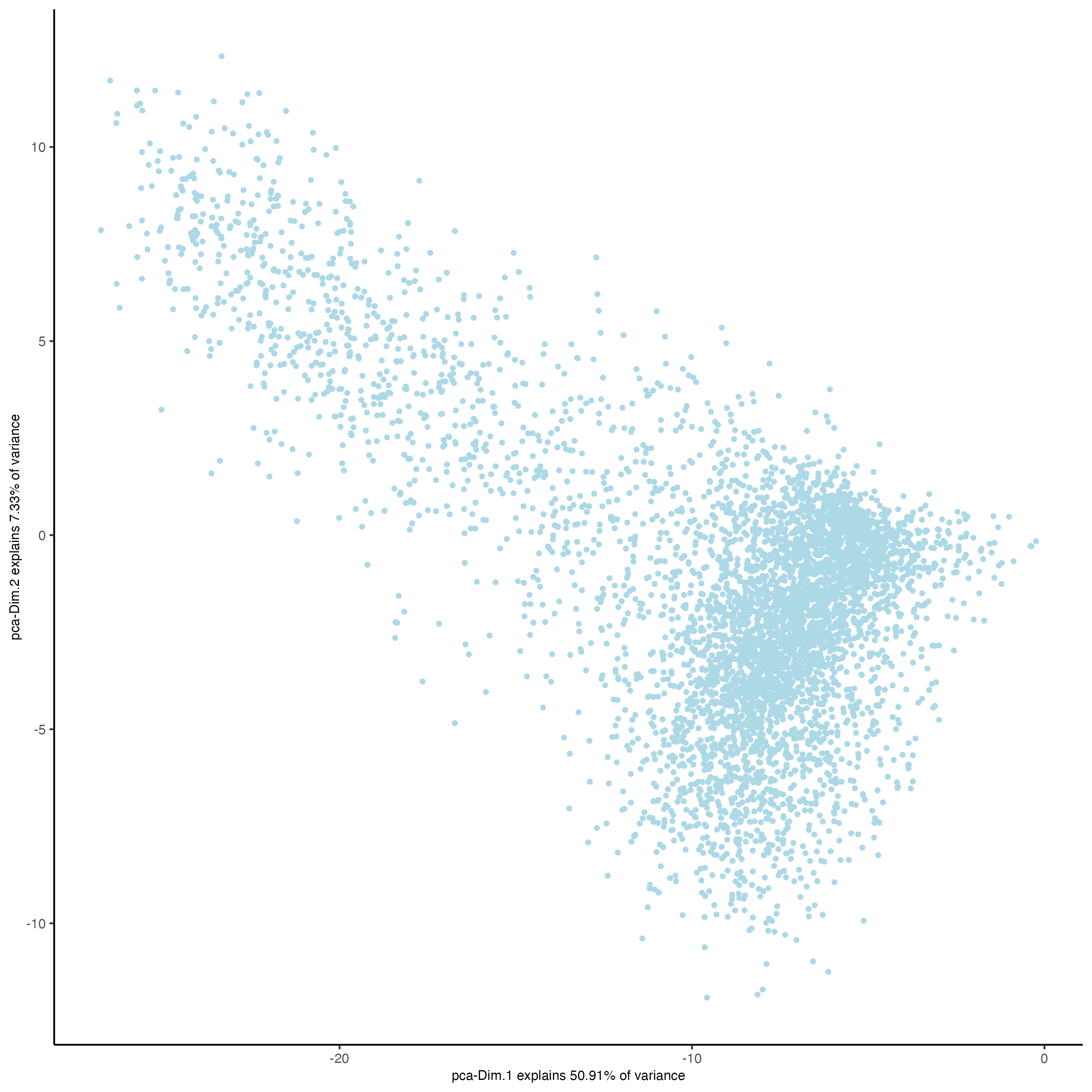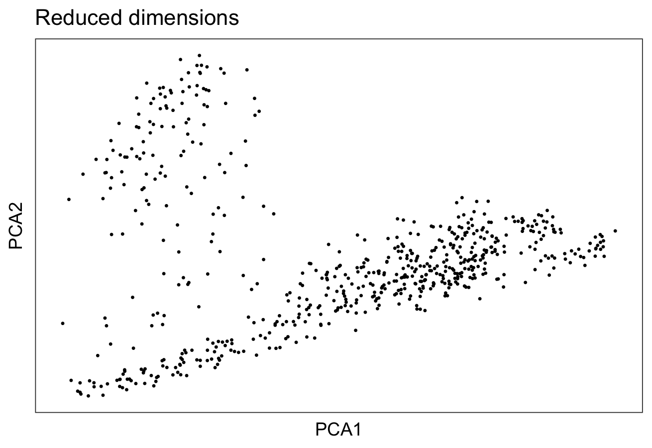 Now we apply dimensionality reduction methods to visualize the data and to generate inputs for further downstream analyses. For this purpose, we use the runPCA method to compute the top principal components and then finally plot the top two components.
