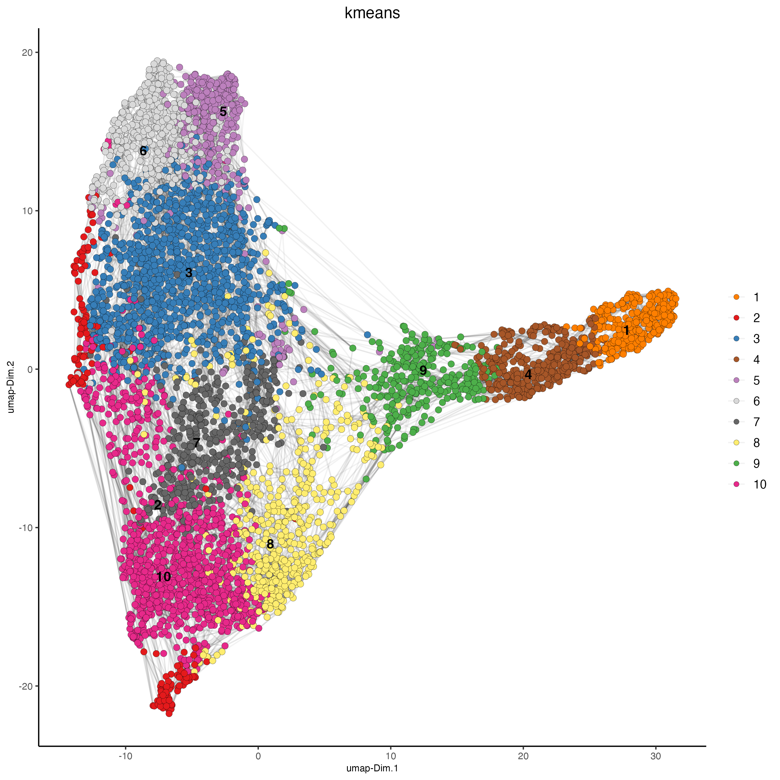 To visualize the clusters, we use a non-linear method “UMAP”, perform clustering and plot the cluster labels over on the UMAP.