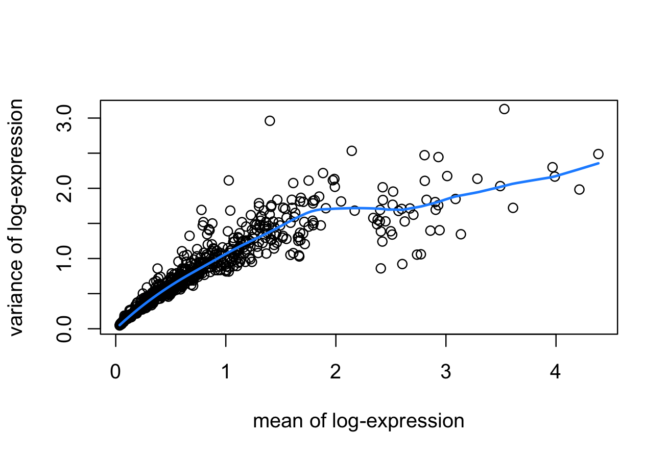 assayNames(spe)To identify HVGs (highly variable genes), we use a mean-variance method “modelGeneVar” from the scran package.
