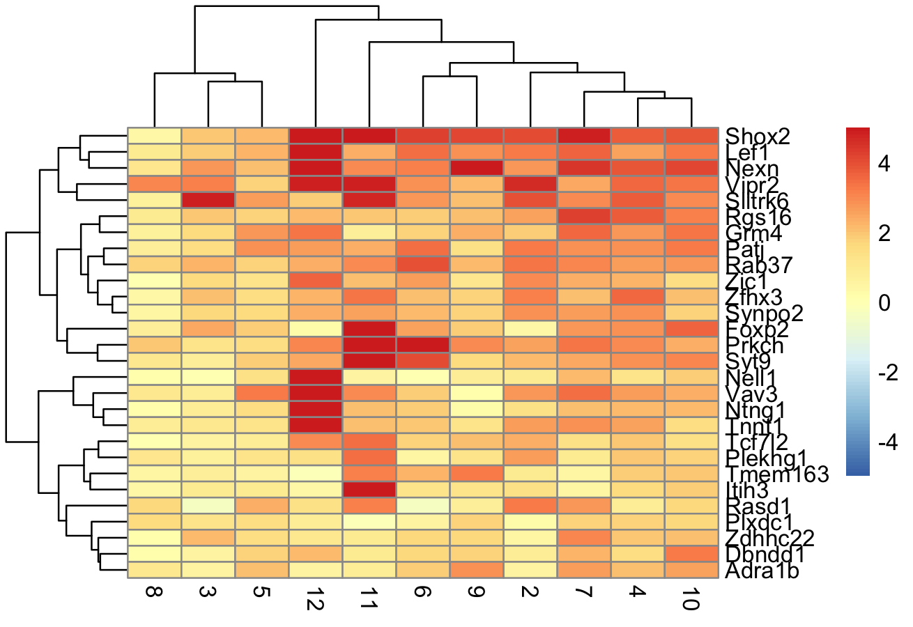 We identify the marker genes in each cluster and visualize the top genes in each cluster using a pheatmap