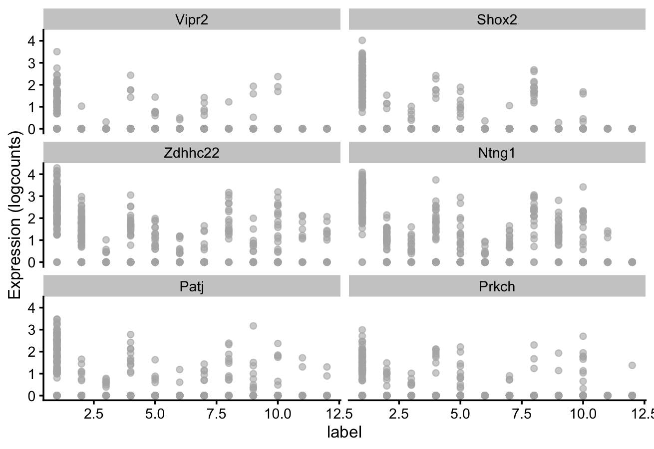 # plot log-transformed normalized expression of top genes for one cluster