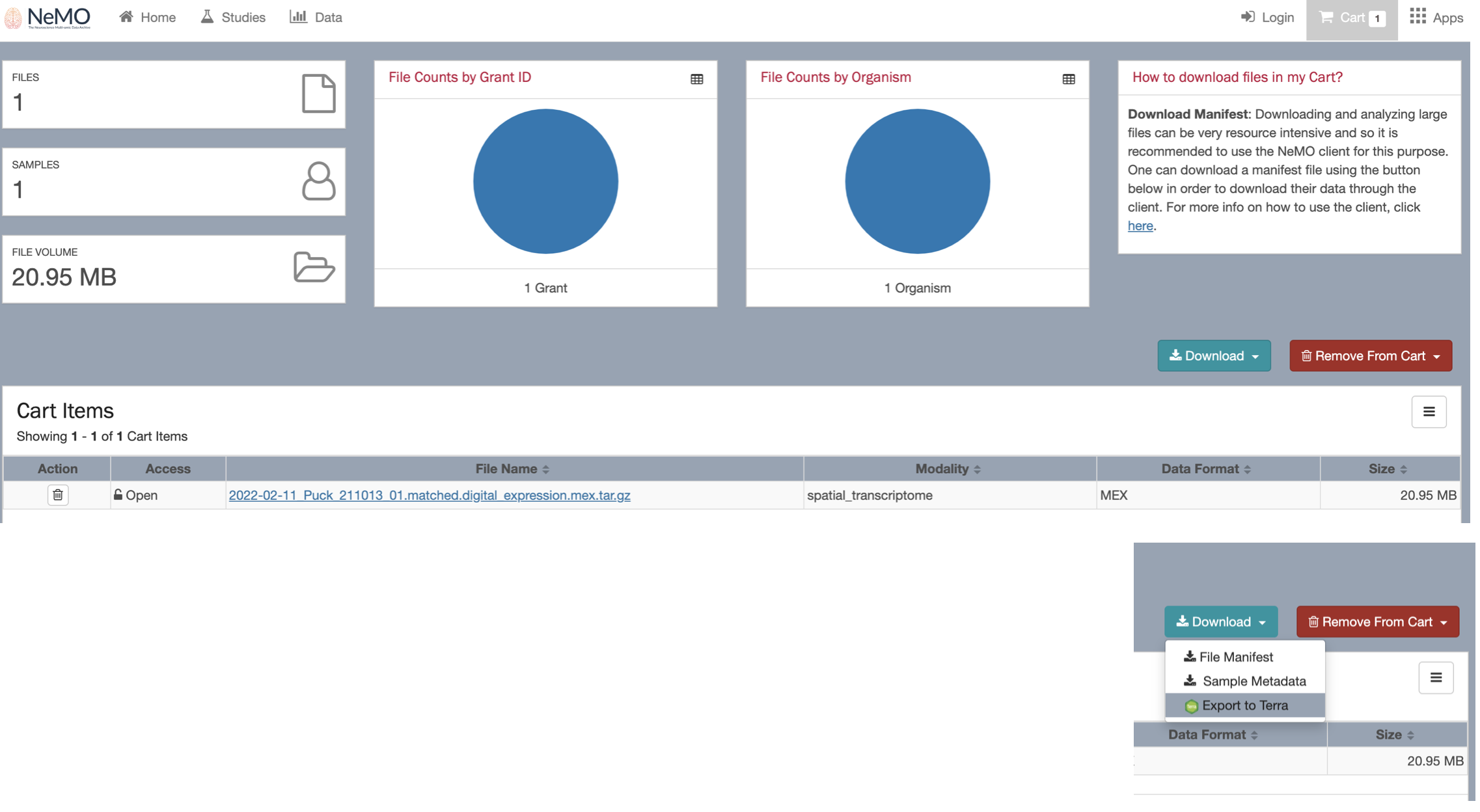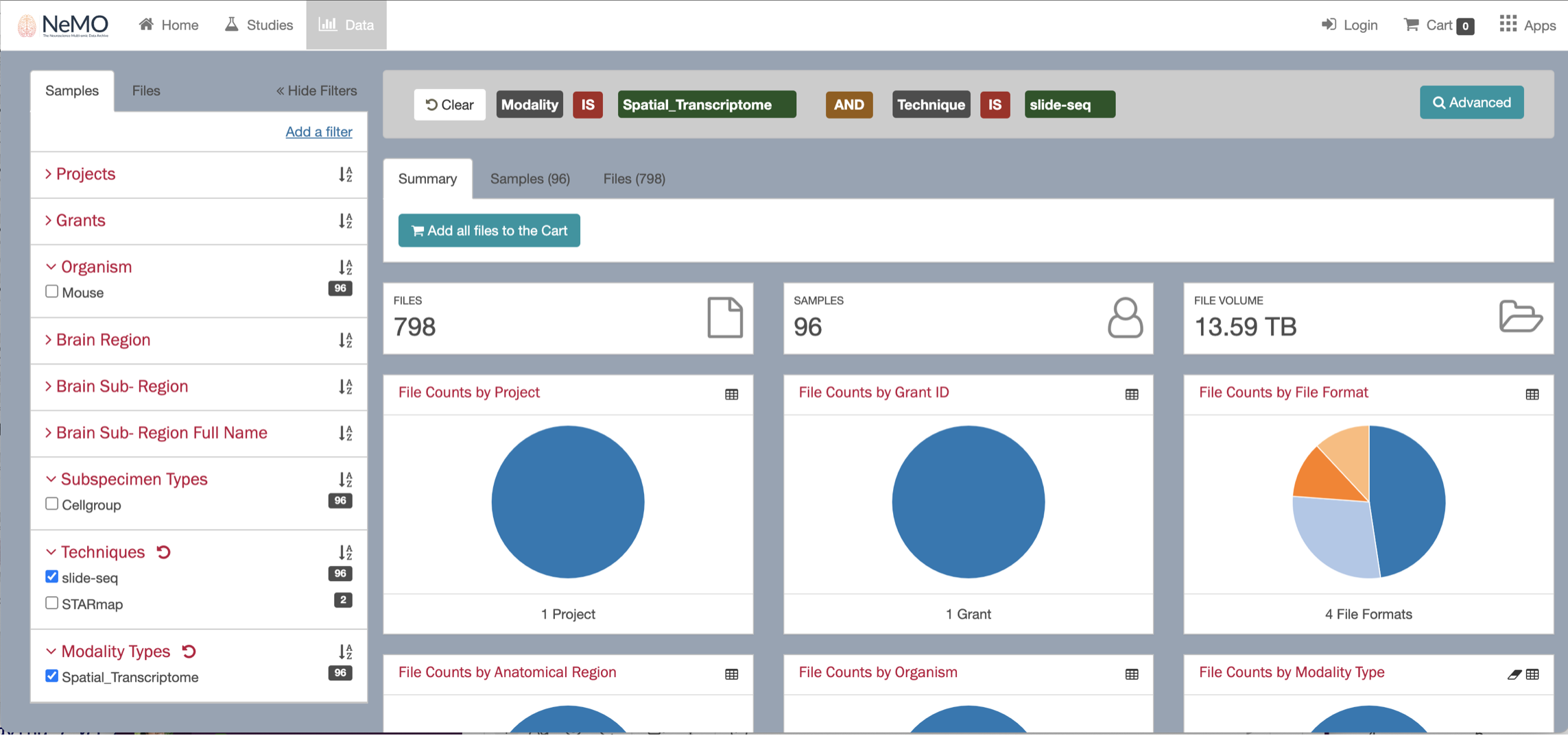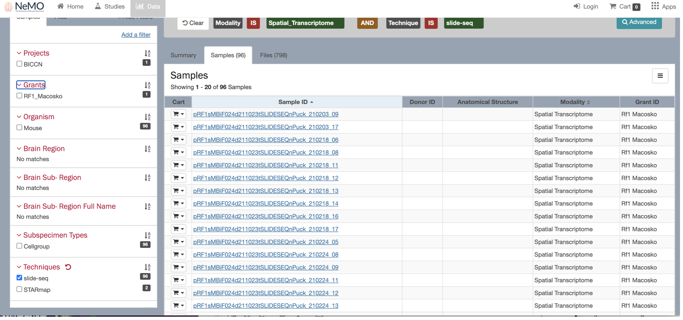 By clicking on the Browse data button, you will be re-directed to the NeMO website. Use the filters menu to select the Slide-seq technology, then chose a sample to download and ddd the file to the cart.