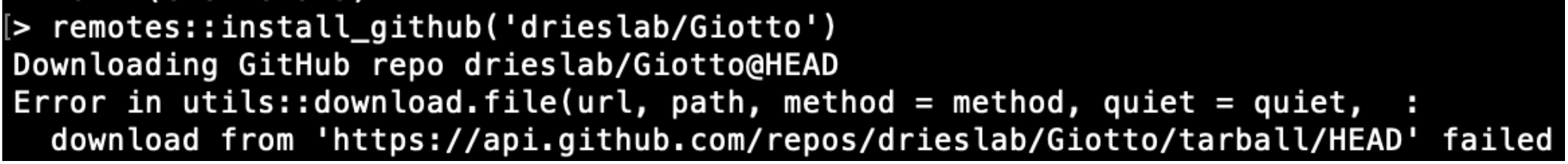 If you’re installing Giotto using the devtools or remote packages, with the most recent version of Giotto, the following error has been observed: